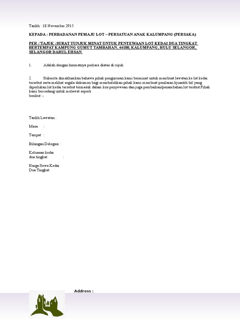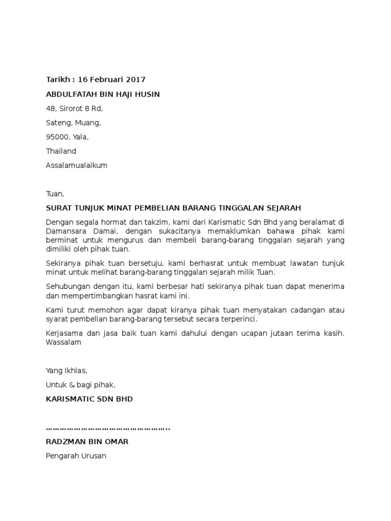 Contoh surat tunjuk minat beli tanah. Unduh sebagai DOC PDF TXT atau baca online dari Scribd. Surat tunjuk sebab ini perlu dikemukakan apabila ingin memberitahu sebab atas tindakan tertentu seperti tidak hadir ke mesyuarat tidak hadir ke kerja dan sebagainya.
