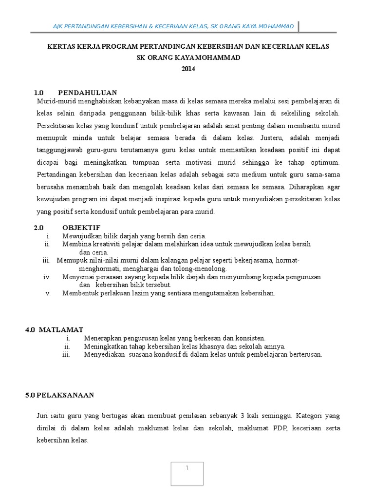Kertas Kerja Program Pertandingan Kebersihan Dan Keceriaan Kelas Pdf